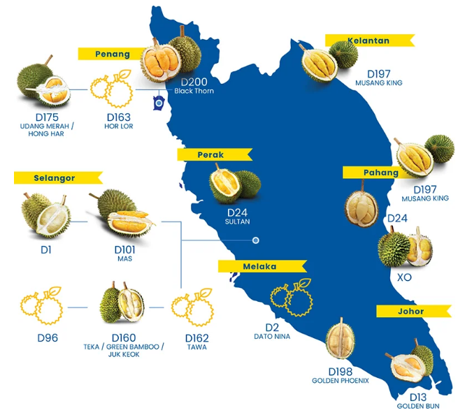 在馬來西亞,大約有200個榴蓮品種有自己獨特的風味和香氣。同時它們也對適宜的生長條件也特定的需要,例如降雨,海拔,溫度和土壤結構。榴蓮僅在成熟季節(jié)才有供應那發(fā)生在每年的六月和七月。那個時節(jié)成熟后從樹上自然掉落的榴蓮,往往會含有較多的果肉和更濃郁的香氣。